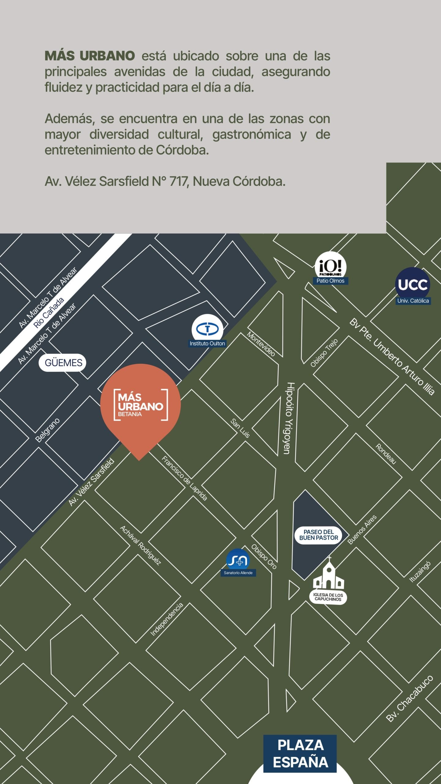 Más Urbano es el nuevo desarrollo de Grupo Betania, ubicado en Av. Vélez Sarsfield 717, en el corazón de Nueva Córdoba, la zona más demandada y rentable de la ciudad.